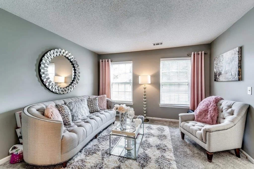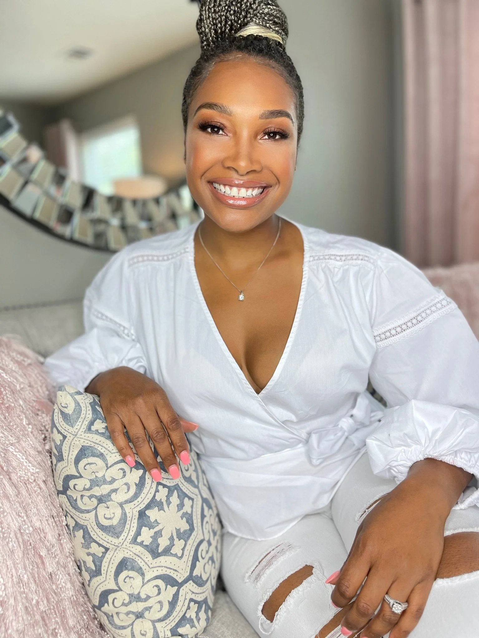 A smiling woman with braided hair tied in a high bun, wearing a white outfit with lace details, silver necklace, and ring, sitting on a sofa with patterned cushions in a well-lit room.